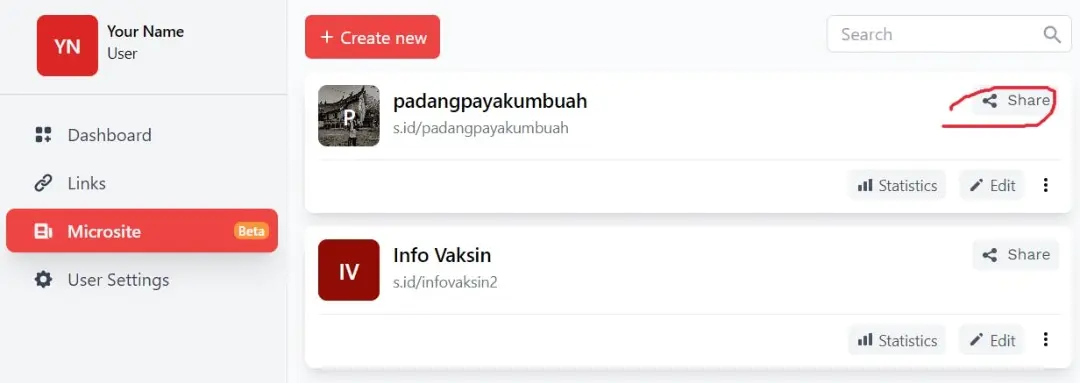 - Pada menu microsite, di sebelah kanan microsite kamu, klik share.