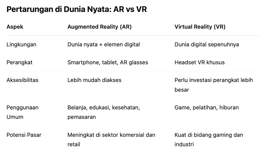Menariknya, di masa depan, AR dan VR kemungkinan tidak akan bersaing secara langsung, melainkan berkolaborasi di bawah konsep baru bernama XR (Extended Reality). XR adalah istilah payung untuk semua bentuk pengalaman digital yang menggabungkan dunia nyata dan virtual.