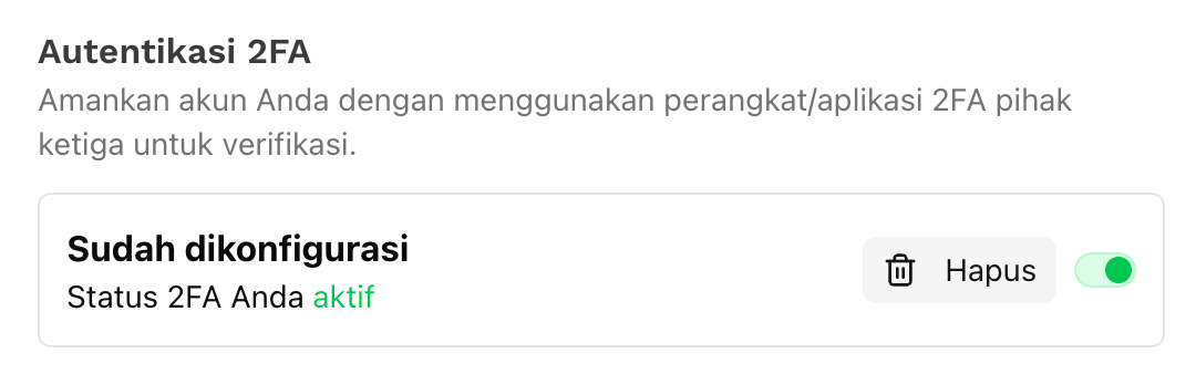 Dengan mengaktifkan Autentikasi Dua Faktor (2FA), Anda menambahkan lapisan keamanan ekstra sehingga akun lebih terlindungi dari peretasan atau akses tidak sah.