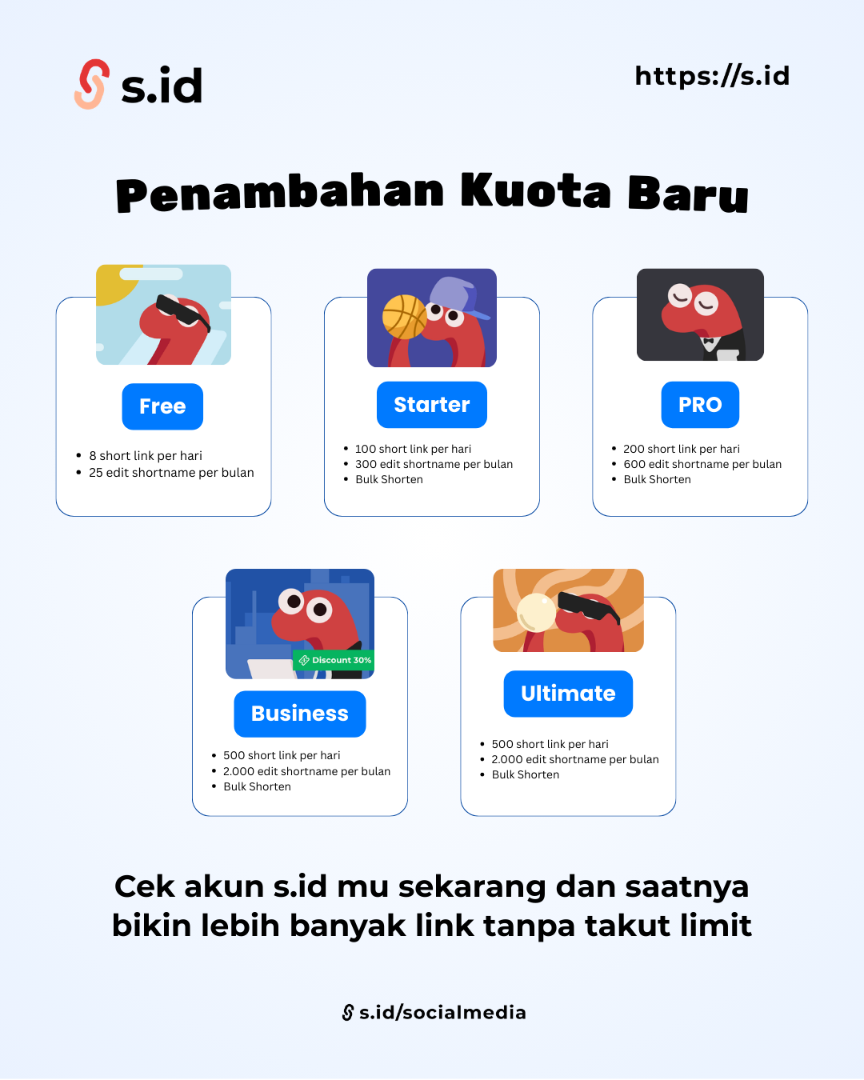 Kami melakukan pembaruan penting pada sistem kuota s.id agar pengalaman kamu dalam membuat short link menjadi lebih nyaman dan fleksibel.