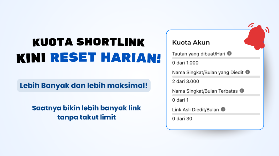 Sebelumnya, kuota pembuatan short link dihitung per bulan. Sekarang, kuota kamu akan di-reset setiap hari pukul 00:00 WIB. Ini artinya kamu mendapatkan jatah kuota baru setiap harinya - tidak perlu lagi menunggu awal bulan.